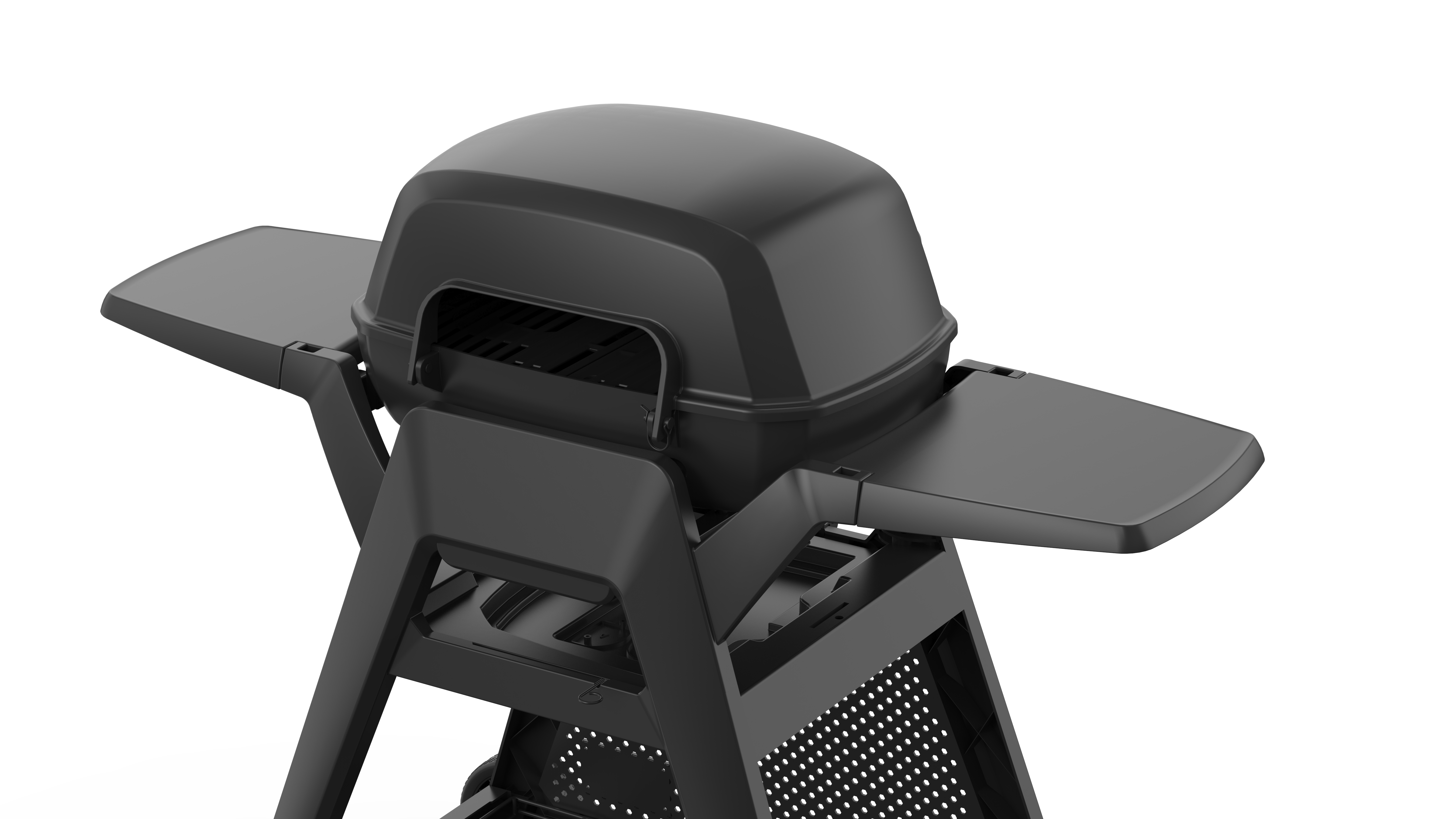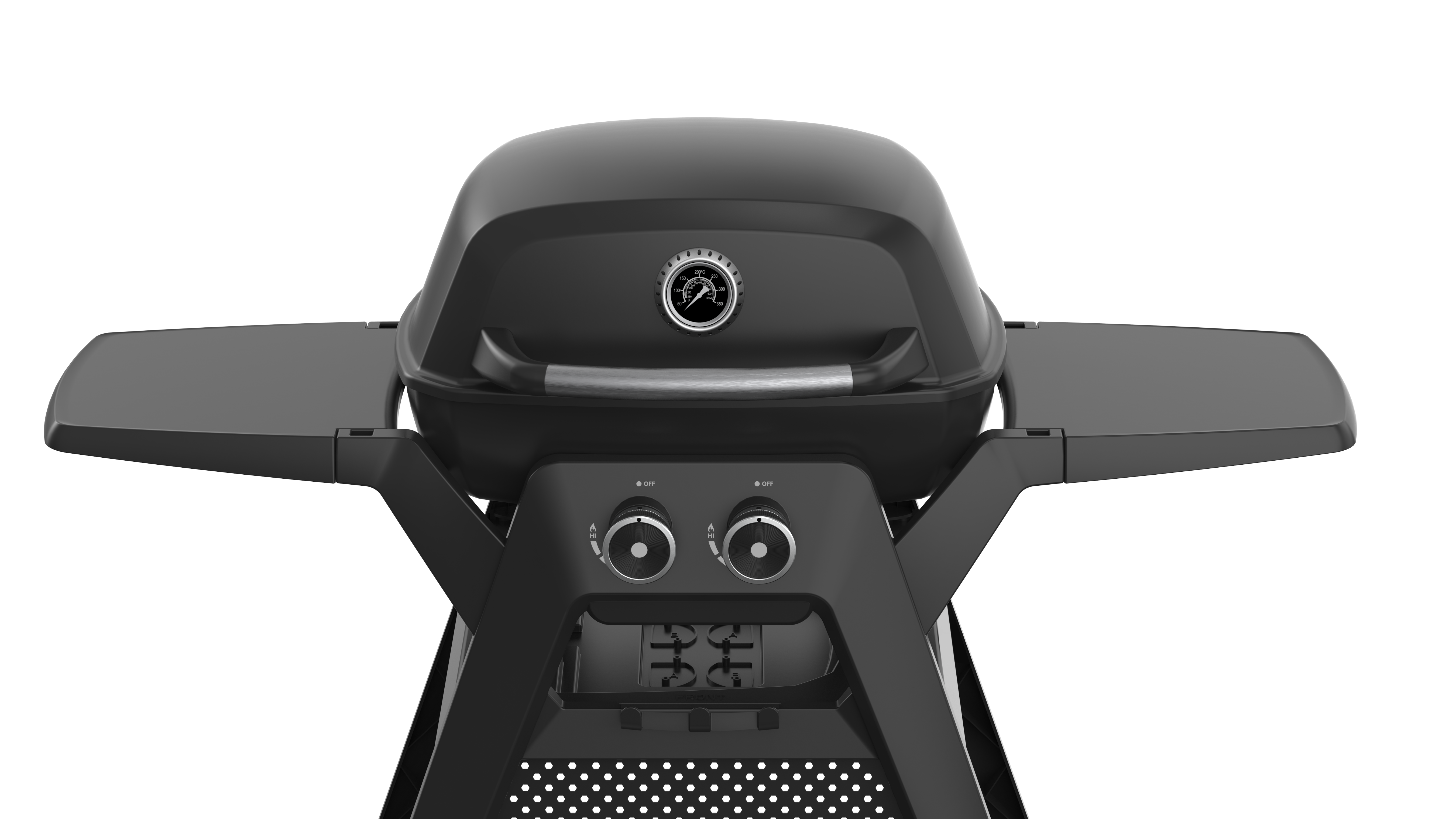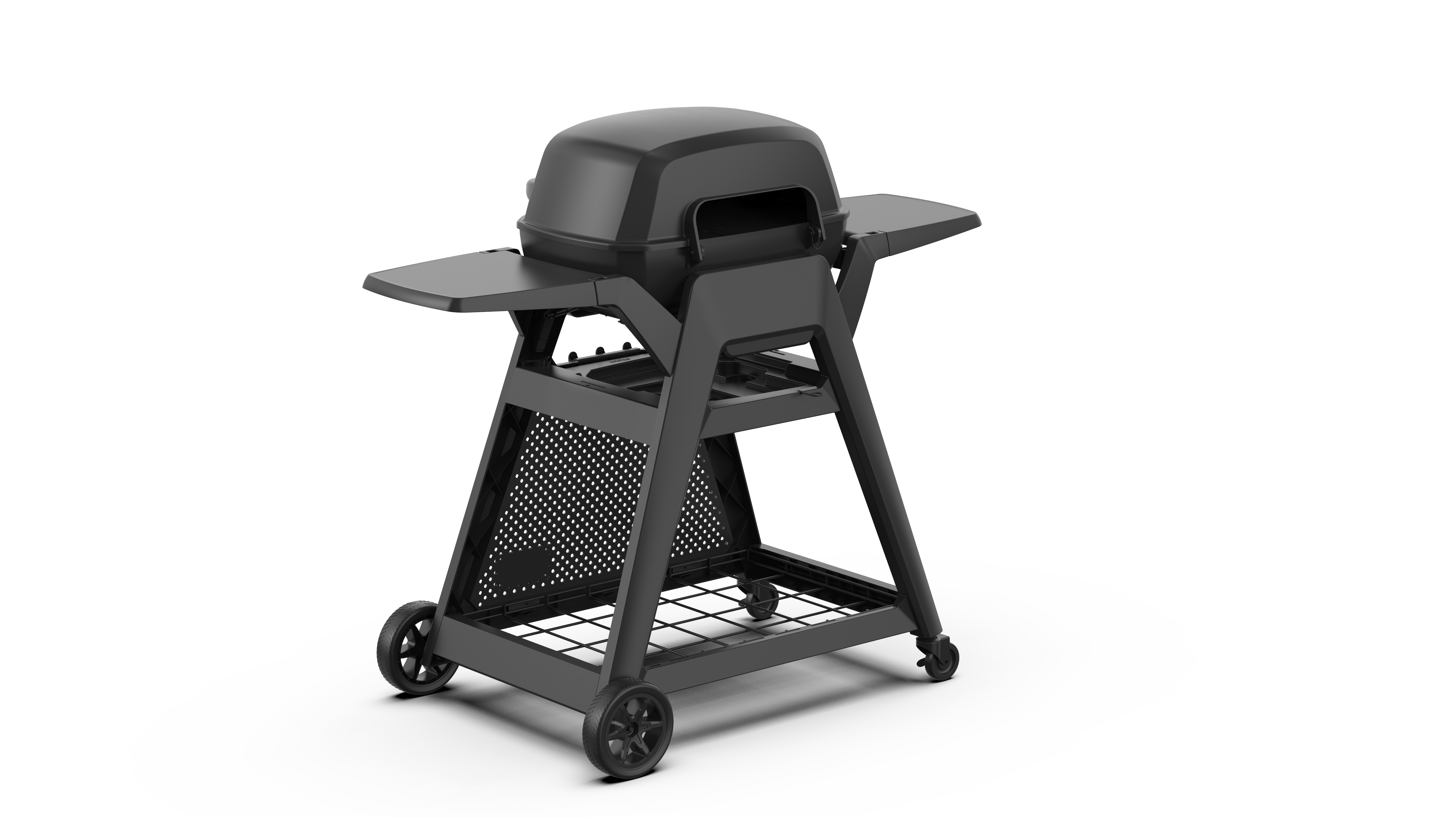 Der Grillwagen des Black Kite 200 bietet Ablagemöglichkeiten für die Fußkappen des BBQs, Gussroste und abnehmbare Seitenablagen – weiter ist der Grill hiermit variabel verschiebbar und durch integrierte Bremsen an zwei Rollen des Wagens in Position zu bringen.