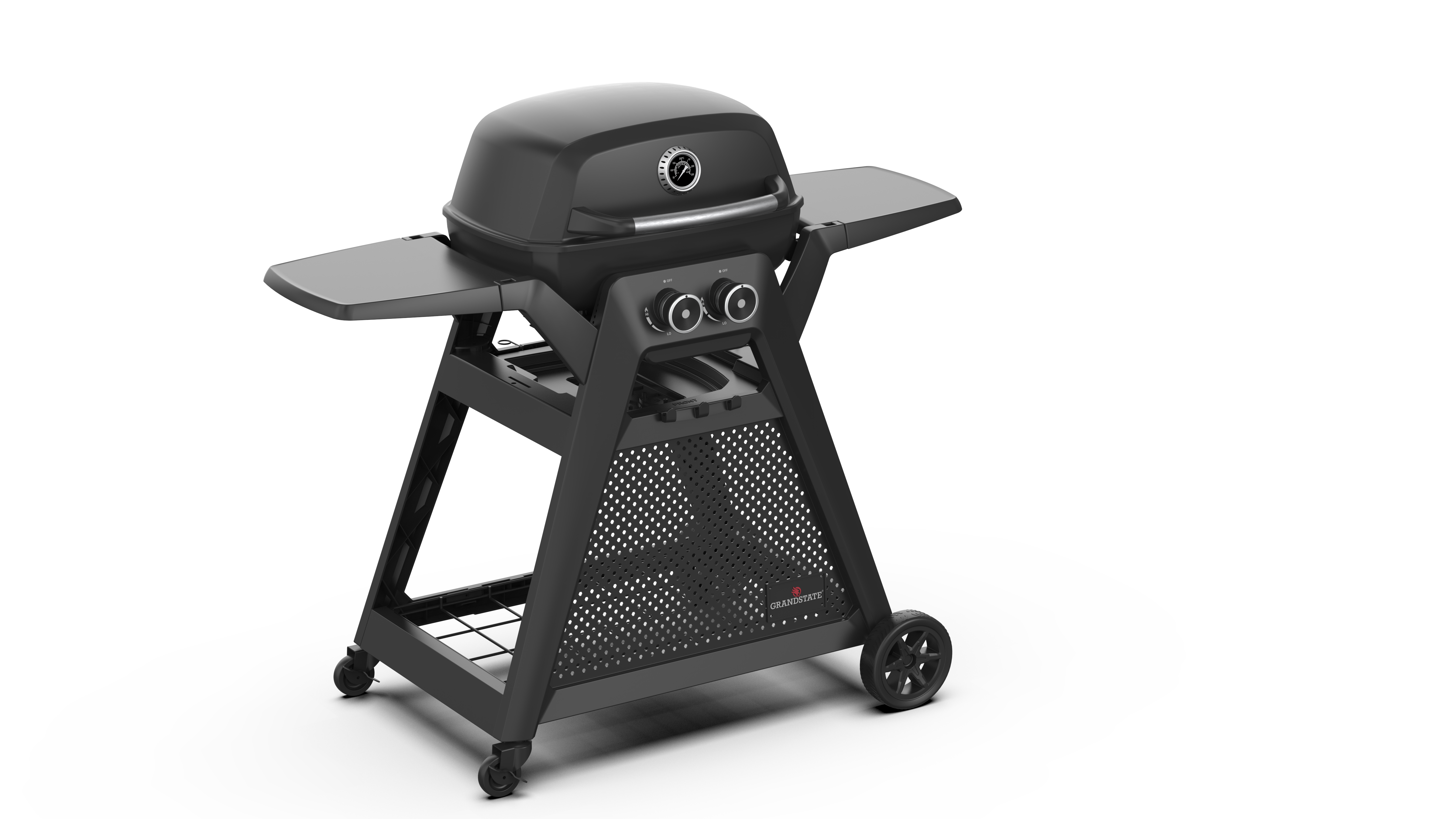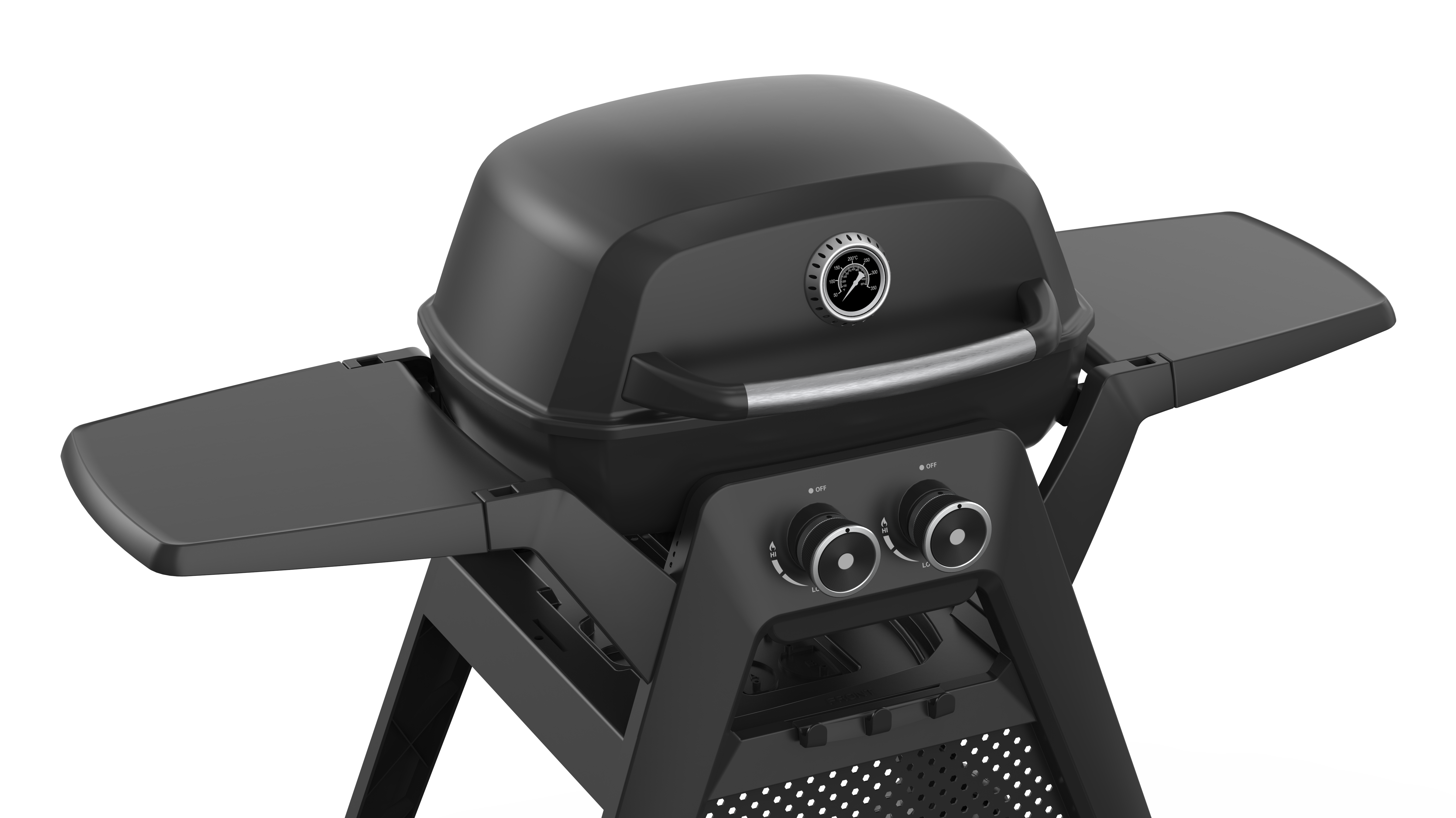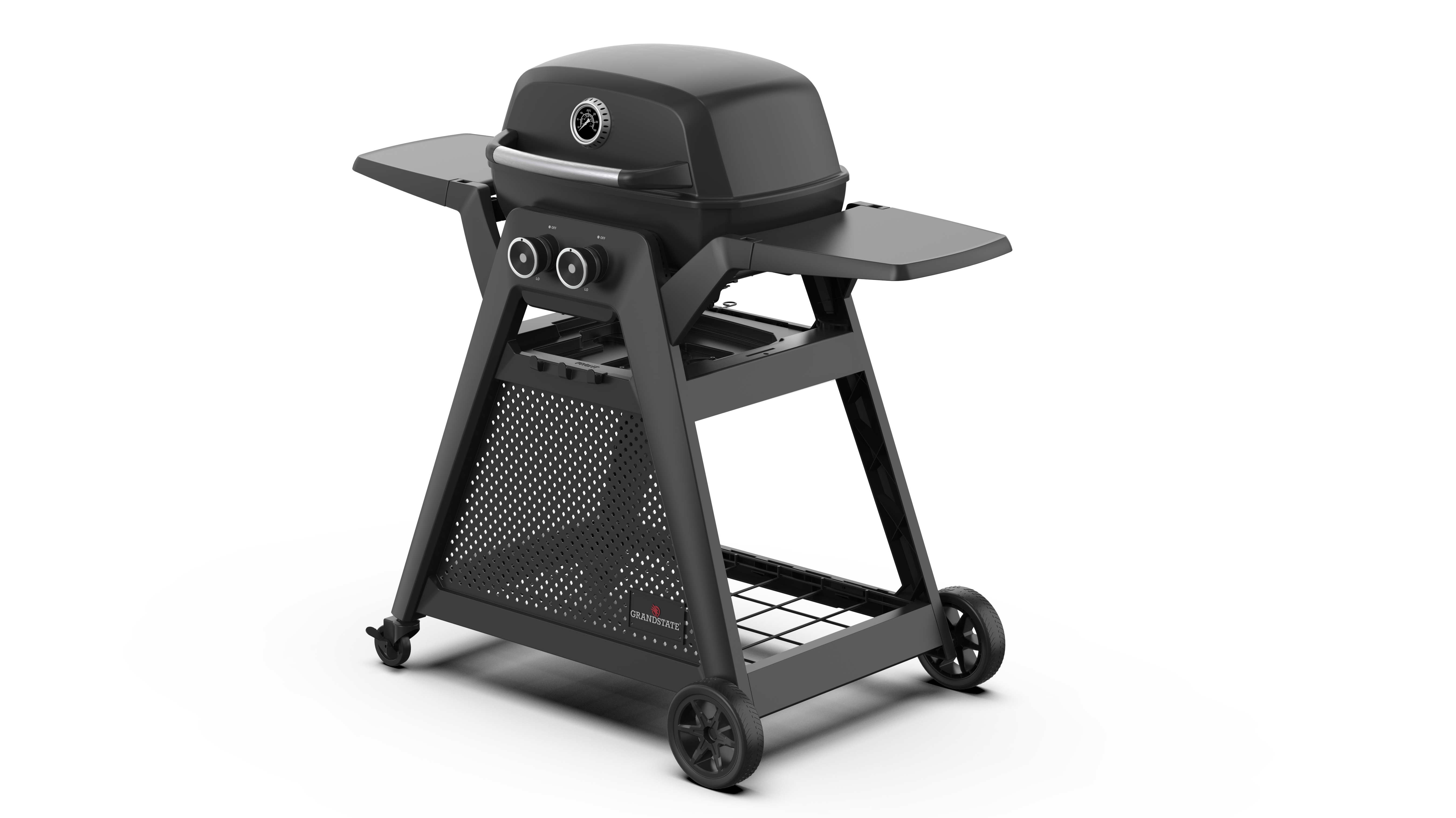 Der Grillwagen des Black Kite 200 bietet Ablagemöglichkeiten für die Fußkappen des BBQs, Gussroste und abnehmbare Seitenablagen – weiter ist der Grill hiermit variabel verschiebbar und durch integrierte Bremsen an zwei Rollen des Wagens in Position zu bringen.