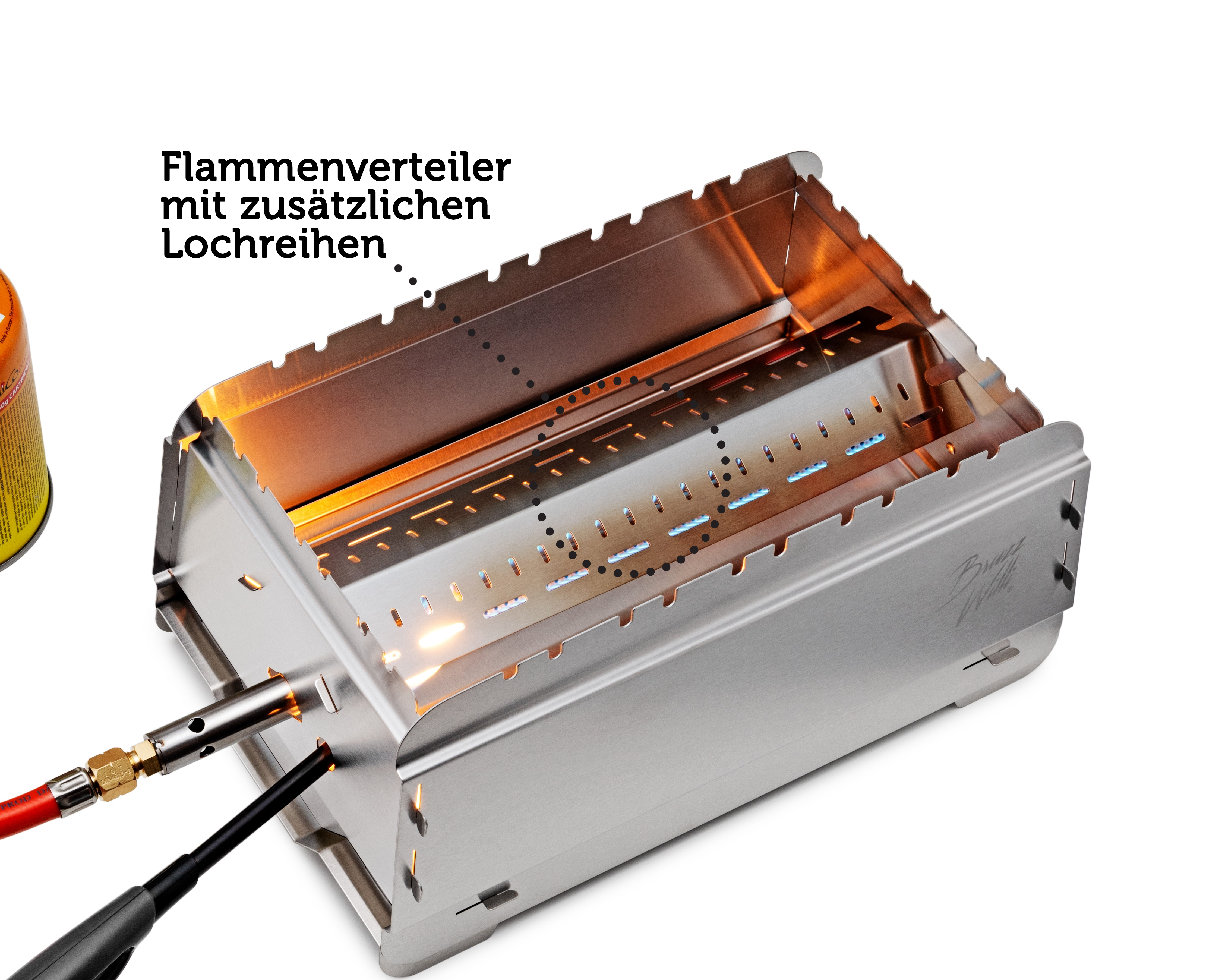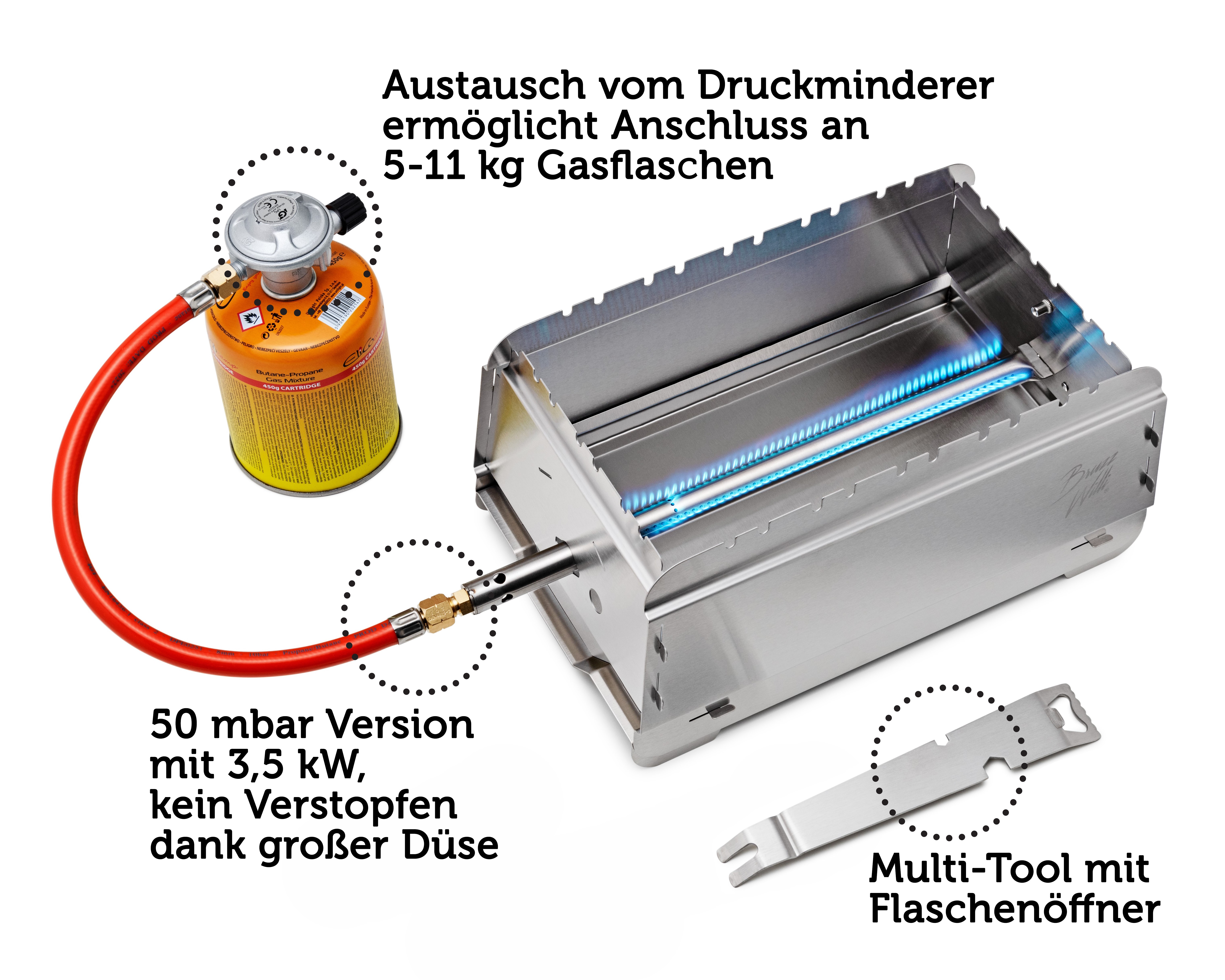 Spar dir zudem den Kauf eines Anschlusssets für Gasflaschen! Der Bruzz Willi BW1.1 ist auf 50 mbar ausgelegt! Tausche den beiliegenden Druckminderer für EN417 Gaskartuschen einfach gegen einen Druckminderer für 5-11 kg Gas-Flaschen aus. Praktisch: Du kannst auch direkt den Schlauch eines großen Gasgrills am Brenner vom Bruzz Willi anschließen, so musst du nicht mal den Druckminderer wechseln.