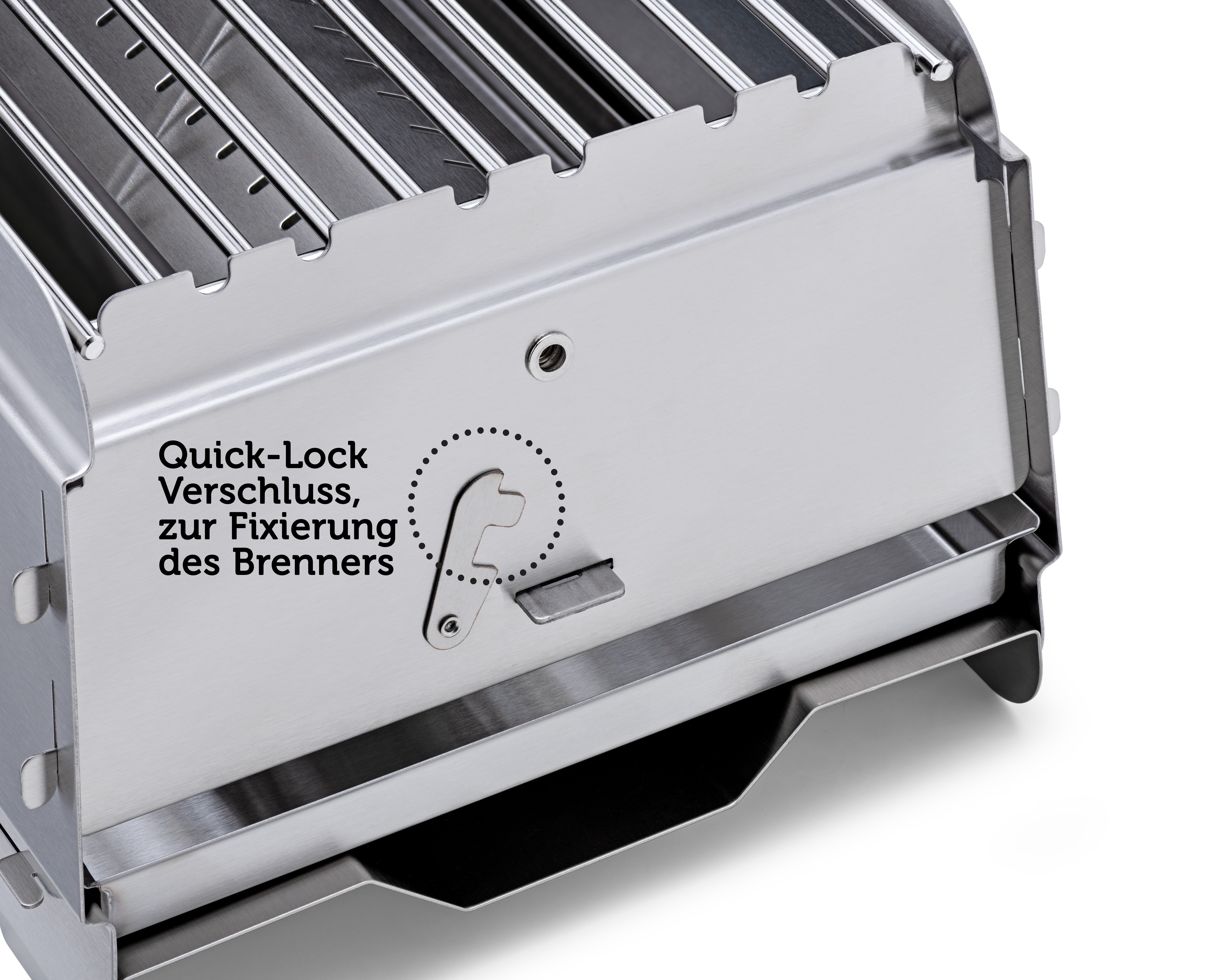 Neuer Quick-Lock Verschluss! Extrem schnelle Befestigung des Brenners durch einfache Fixierung vom Sicherungsbügel im Brenner.
