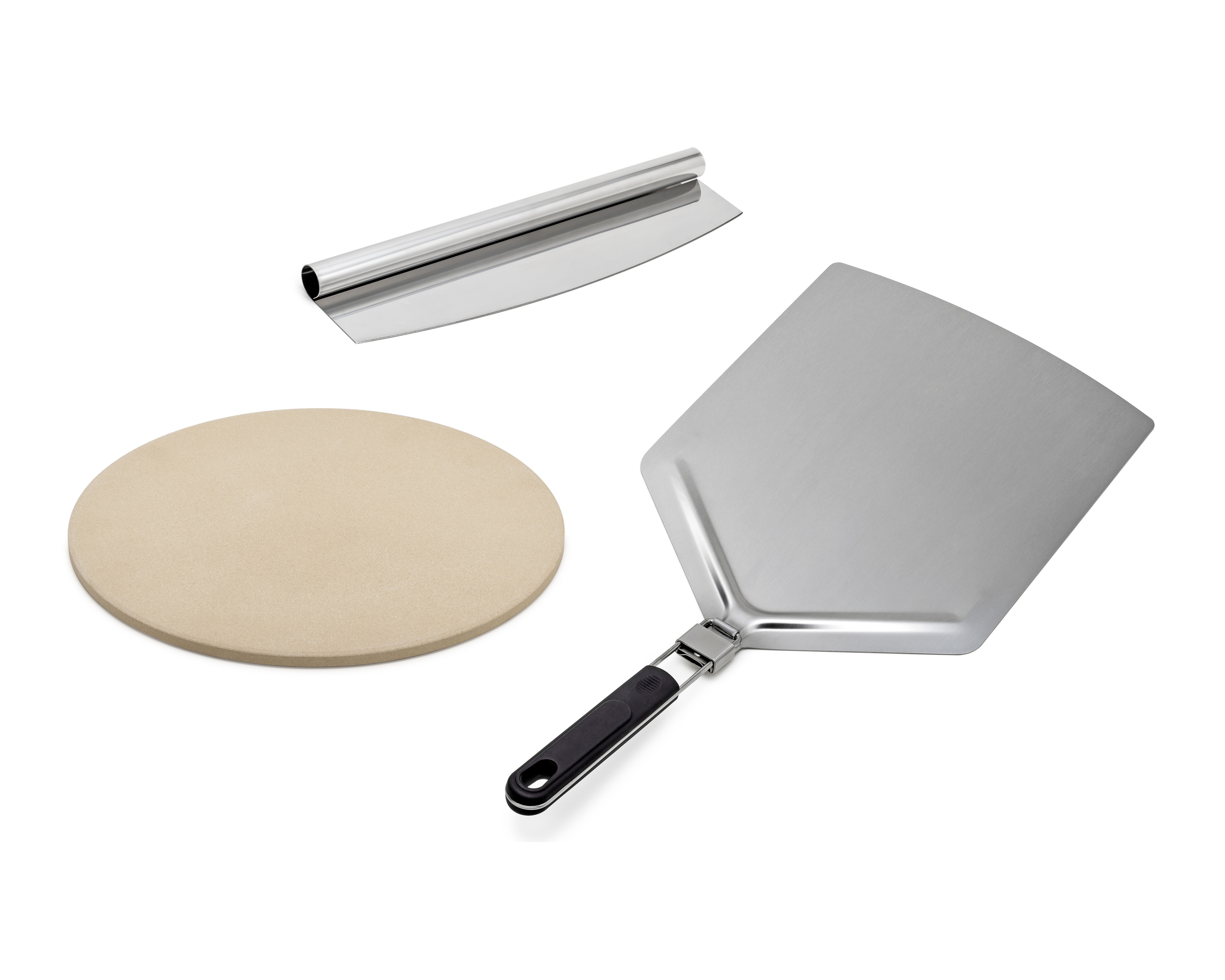 bestehend aus Pizzastein, Pizzaschneider und Pizzaheber