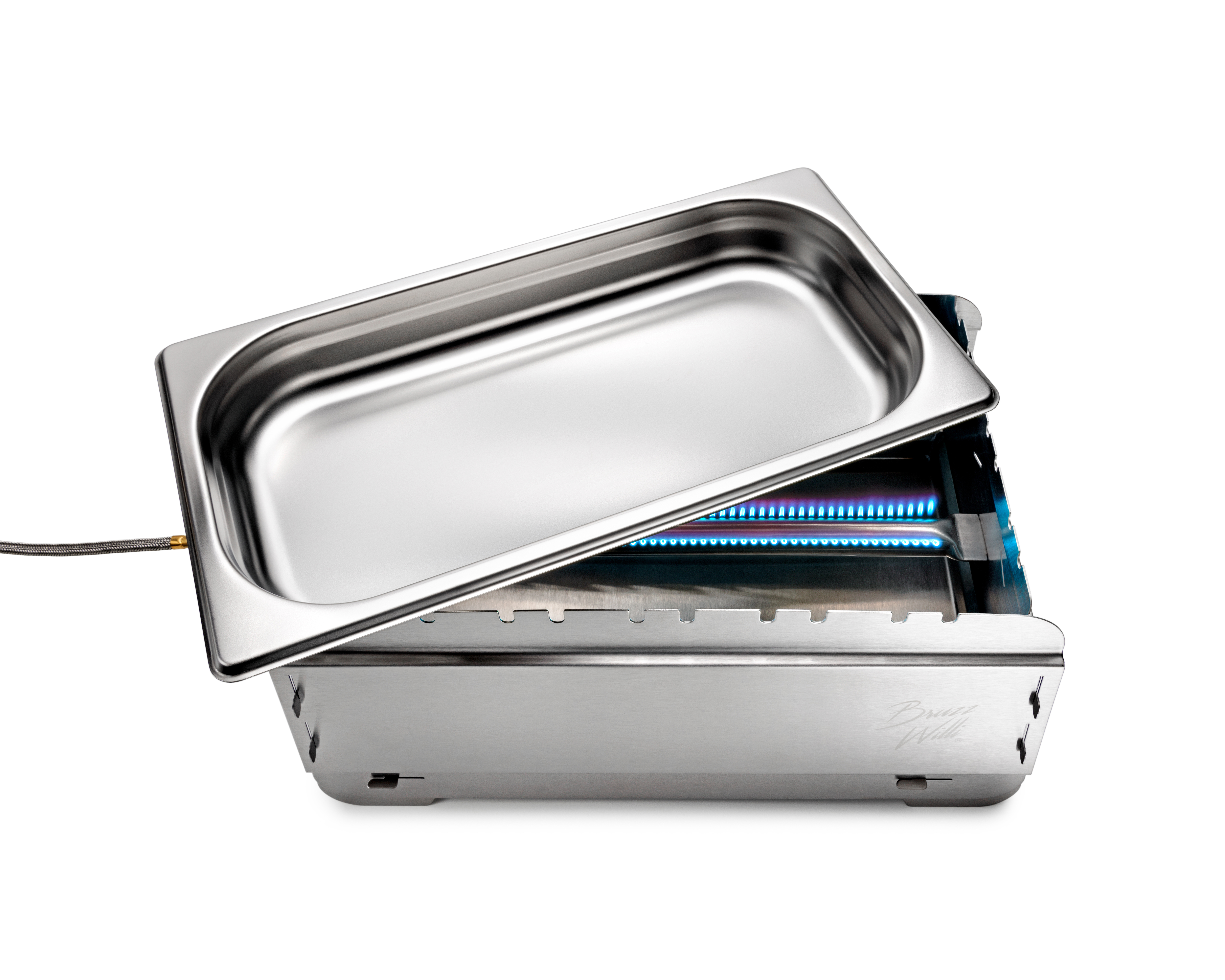- Die Schale einfach anstelle des Grillrosts auf dem Bruzz Willi BW1 oder Bruzz Willi BW1.1 platzieren, den Flammenverteiler vorher herausnehmen