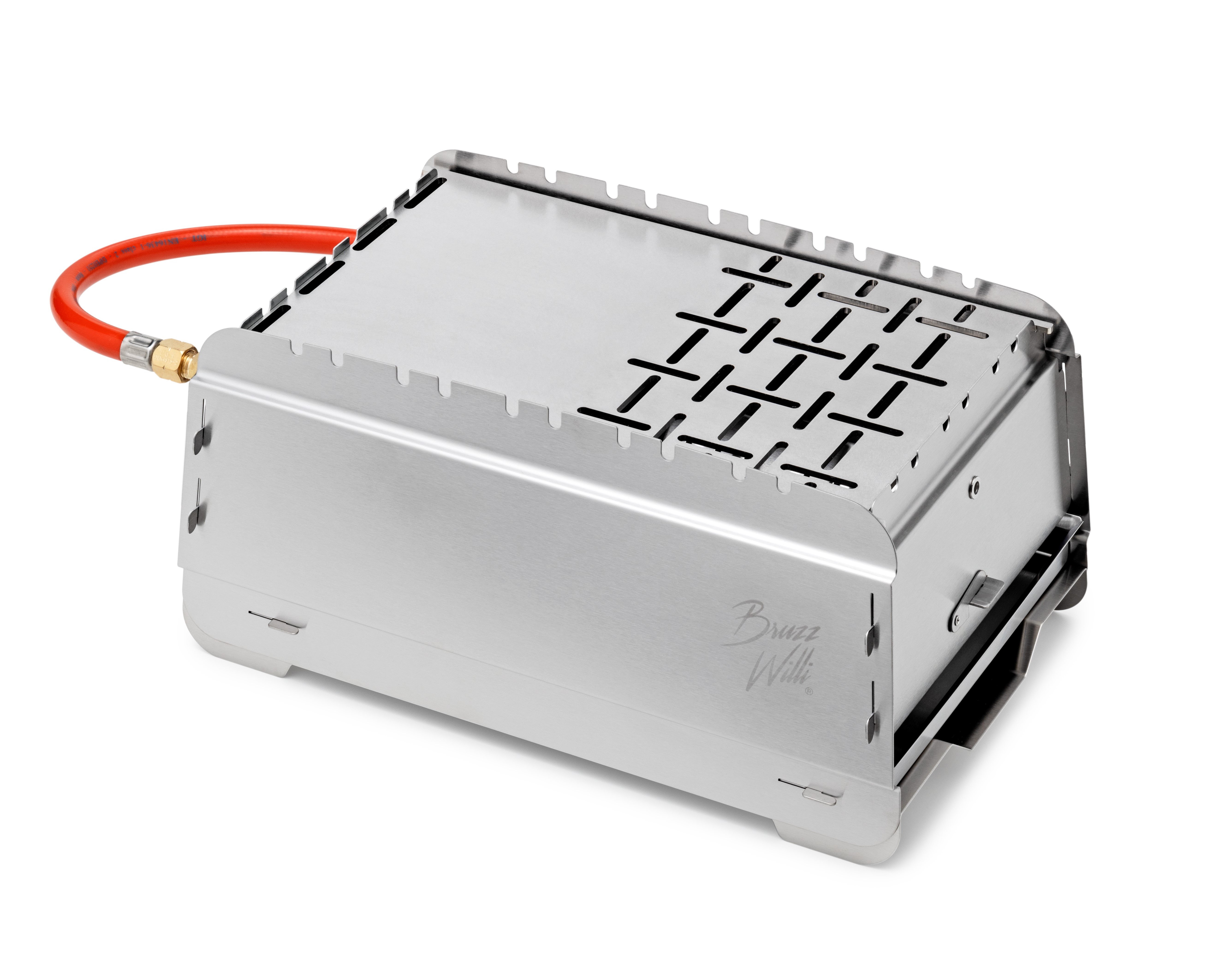 Ein Anschlusssets für Gasflaschen brauchst du bei diesem Kompaktgrill nicht! Der Bruzz Willi BW1.1 ist auf 50 mbar ausgelegt! Tausche den mitgelieferten Druckminderer für Gaskartuschen mit EN417 Schraubgewinde einfach gegen einen passenden Druckminderer für große Gasflaschen aus. Praktisch: Du hast zudem die Möglichkeit, den Schlauch deines großen Gasgrills am Brenner vom Bruzz Willi anzuschließen.