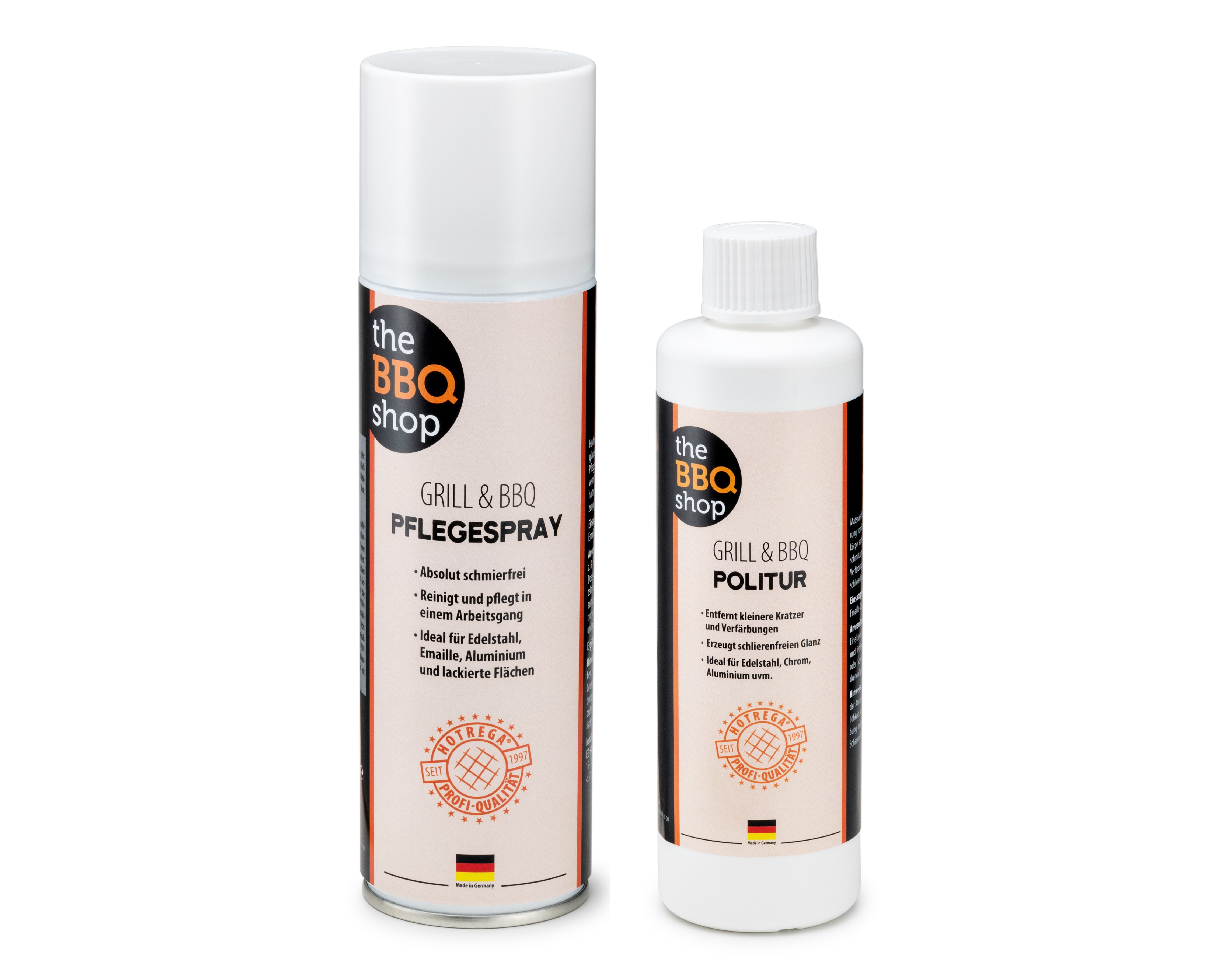 Dieses starke Team lässt deinen Edelstahlgrill wieder neu erstrahlen! Die feinen Polierkörper in unserer Politur entfernen während des Verteilens porentief und effektiv Verschmutzungen, Rost, kleine Kratzer, Anlaufstellen und leichte Verfärbungen. Das Pflegespray wirkt nach dem Auftragen wie ein Schutzfilm auf der Oberfläche deines Grills, Fingerabdrücke und hartnäckige Fett-, Öl- und Kalkverschmutzungen werden verringert. Gönne deinem Grill eine solche Behandlung, er hat es sich verdient und du erhöhst hierdurch seine "Lebenszeit".