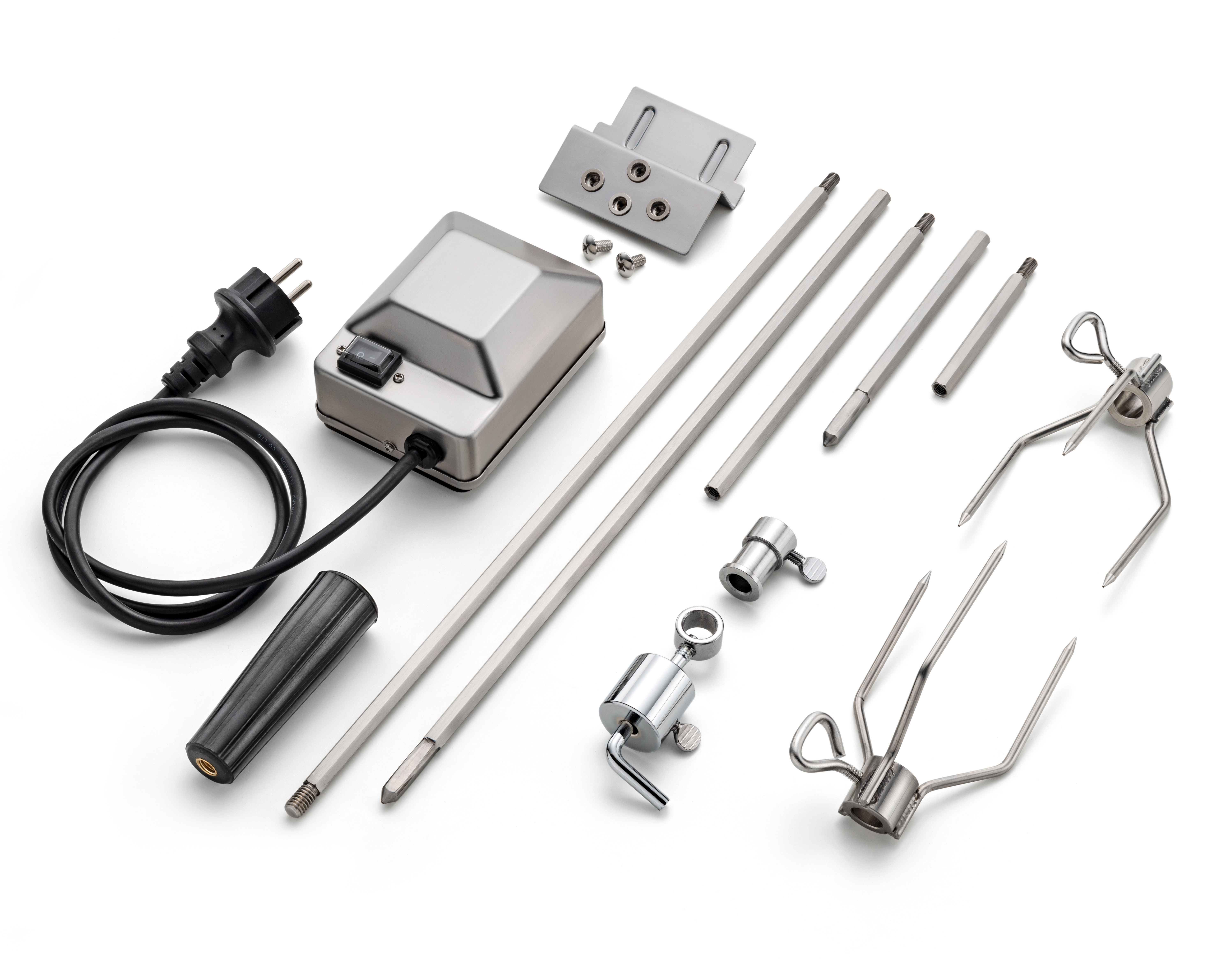 • Grillspieß Set enthält: Motor, Spießstangen, Fleischgabeln, Motorhalter