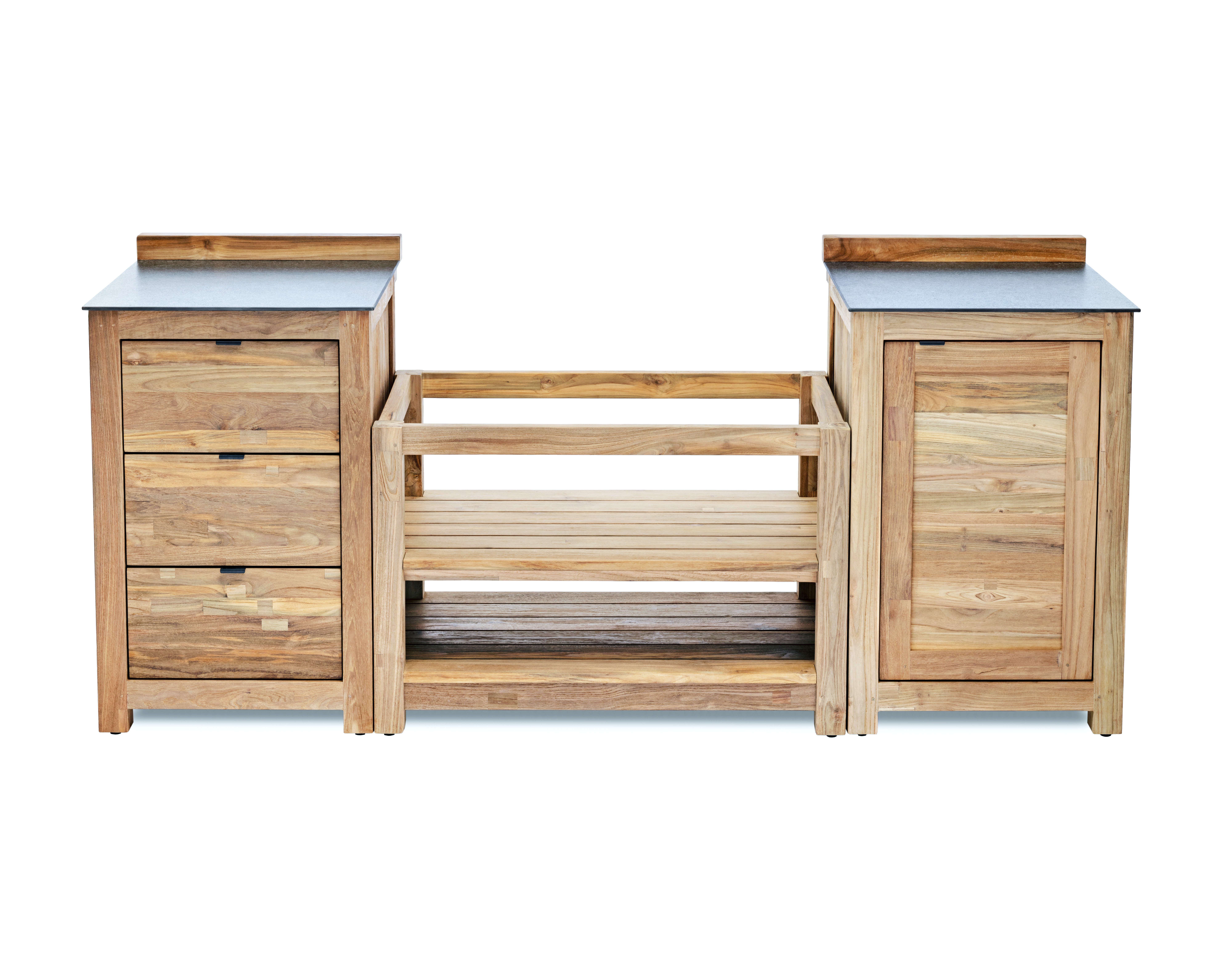 bestehend aus 3 Modulen- Outdoorküche aus Teak mit Türschrank, Schubladenschrank und Mittelkonsole für Built In Grillgeräte